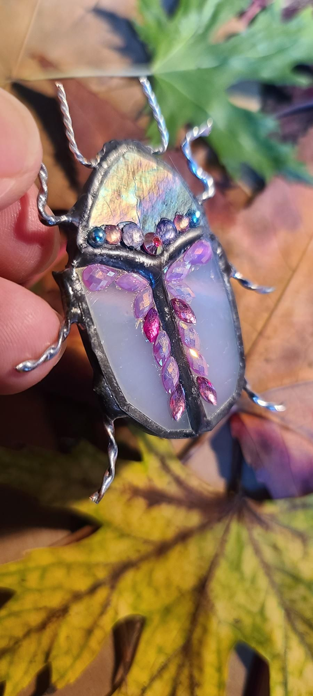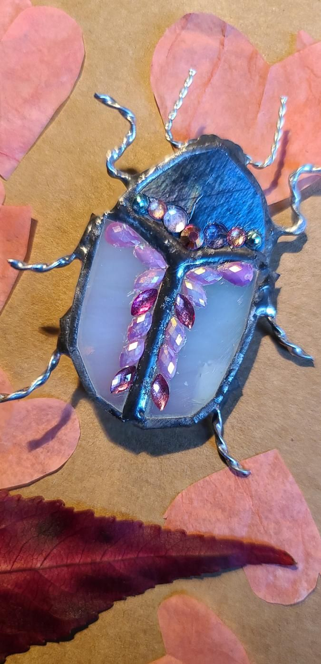 Scarabée en Tiffany, au corps blanc iridescent et à la tête argentée monté en broche.