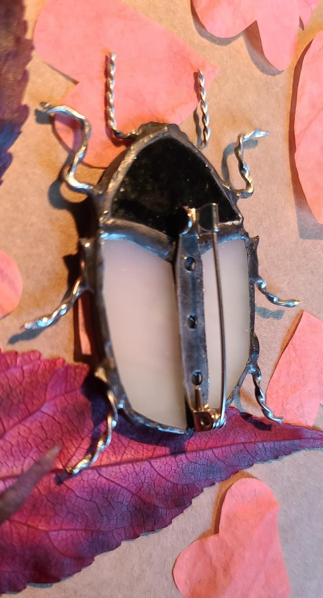 Scarabée en verre au corps blanc iridescent et à la tête argentée, en Tiffany et monté en broche.