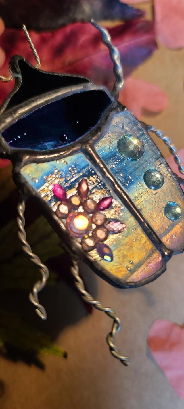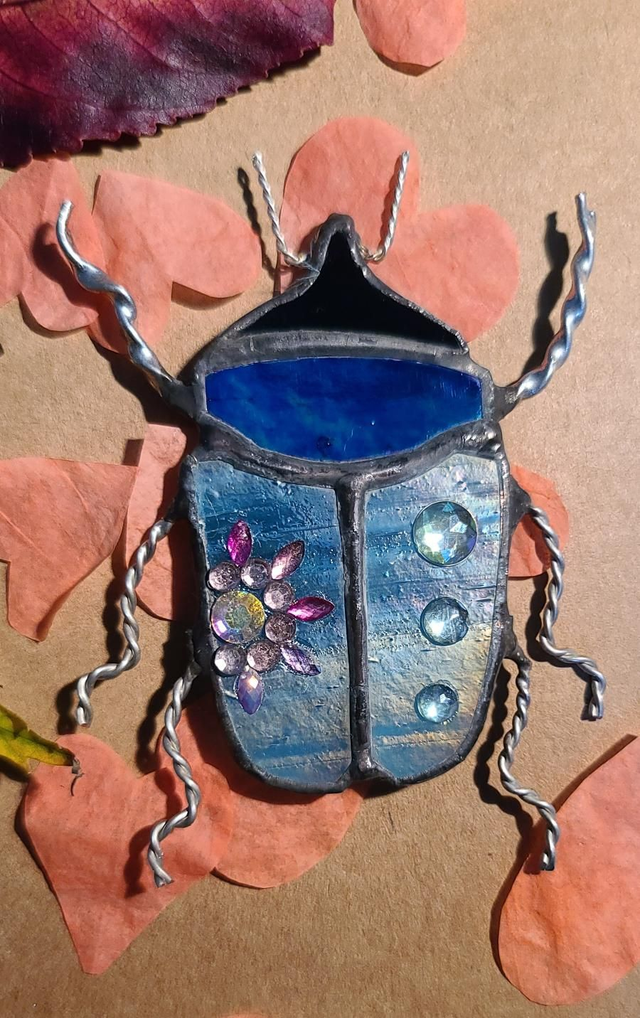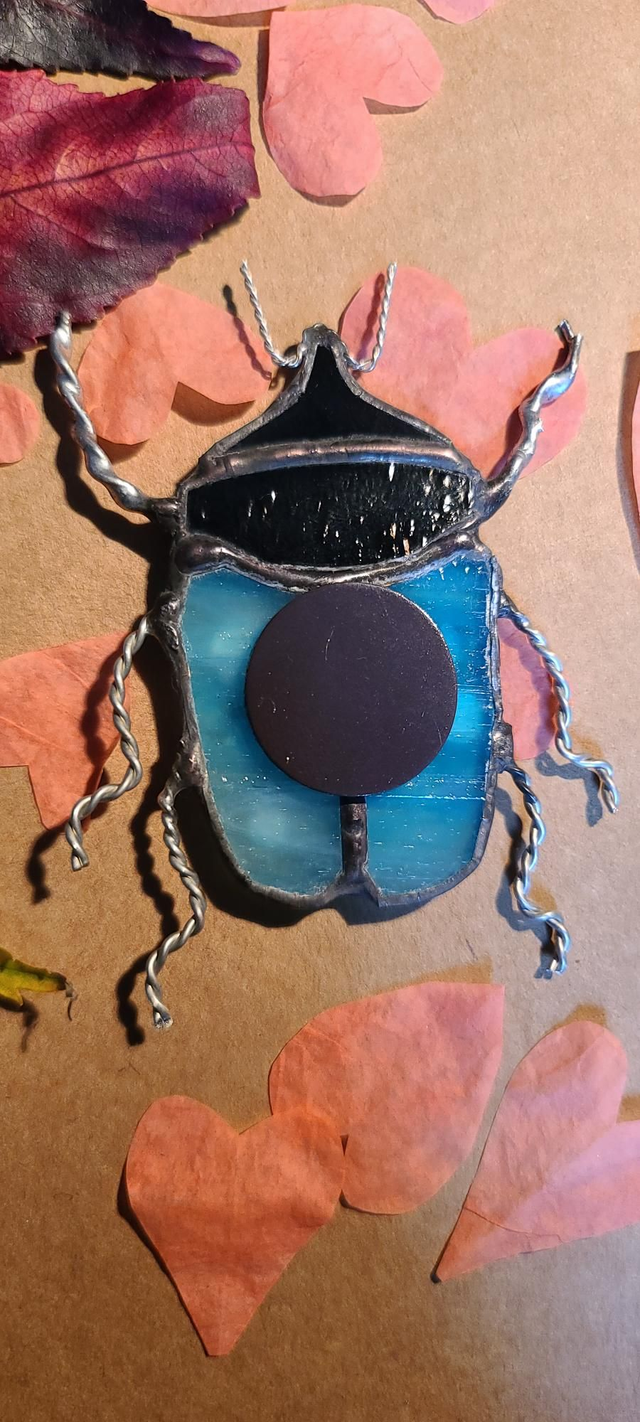 Scarabée au corps bleu iridescent et à la tête noire, en Tiffany et monté en magnet avec un aimant.