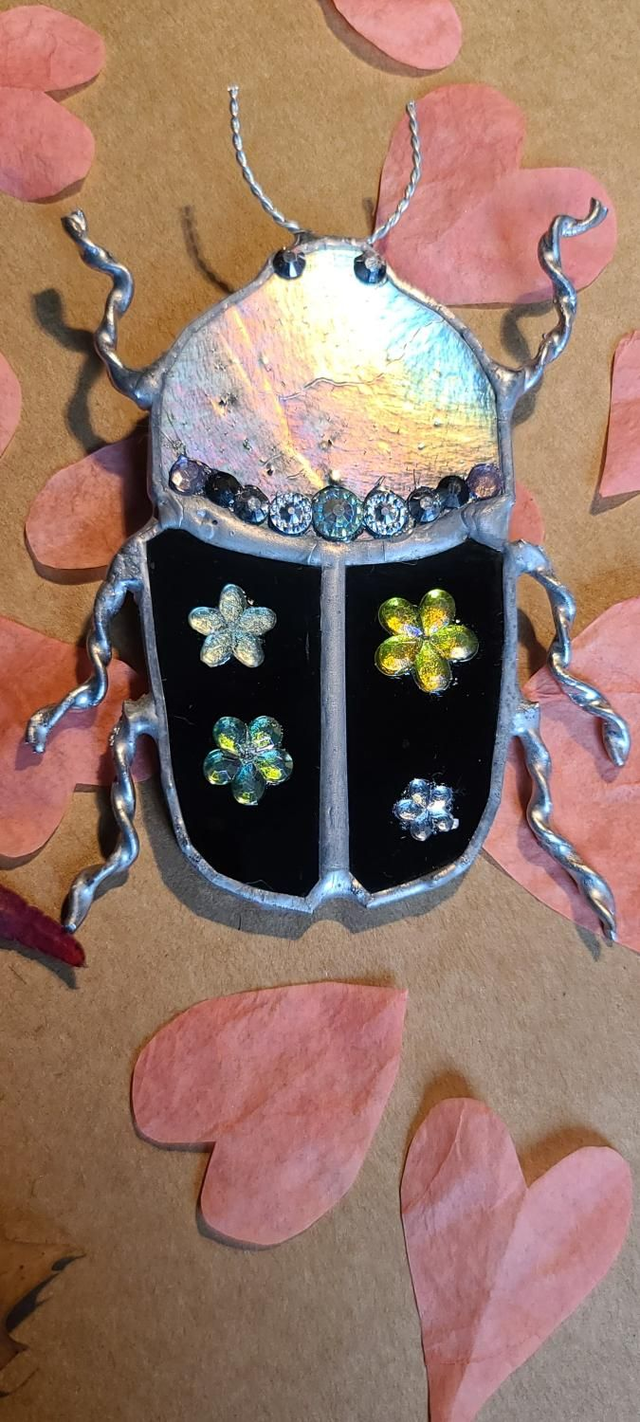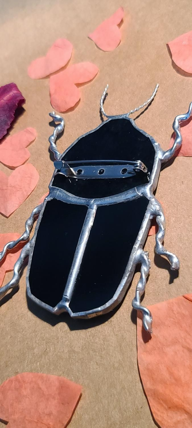 Scarabée en verre, au corps noir et à la tête argentée iridescente, en Tiffany et monté en broche.