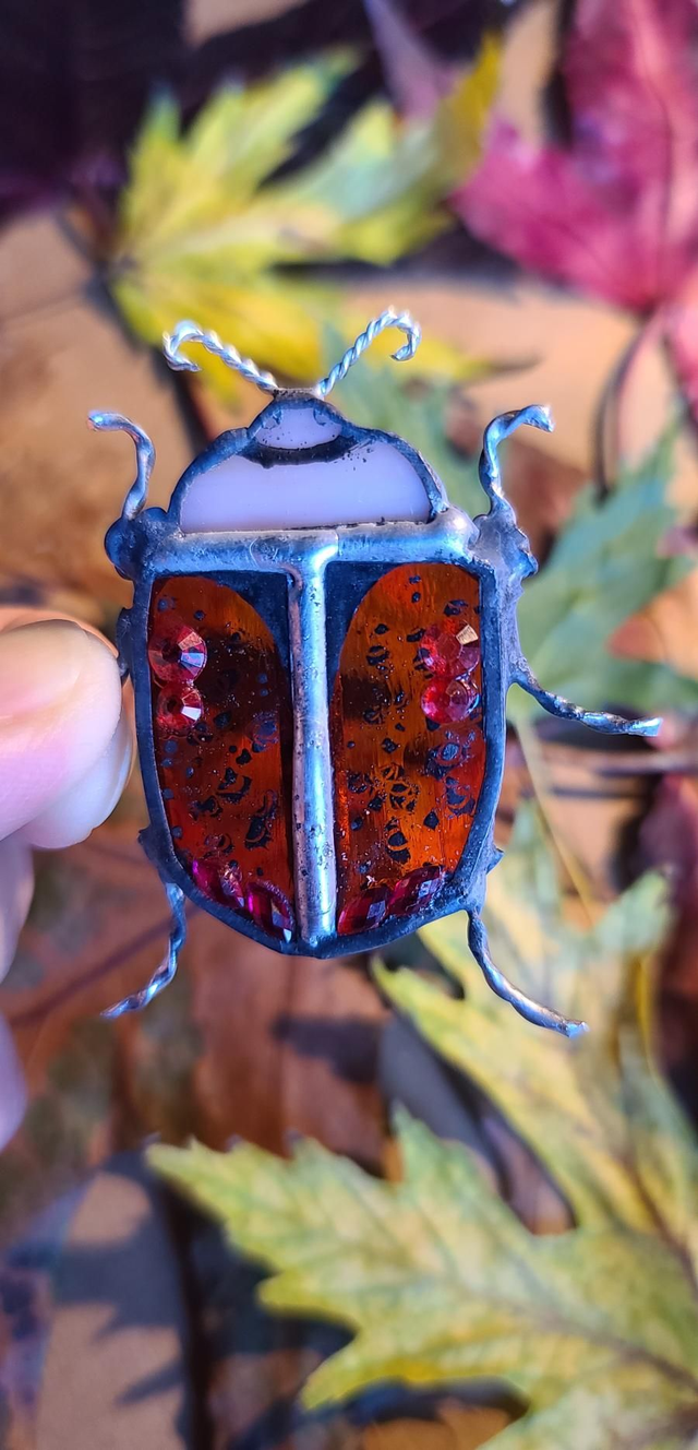 Scarabée rouge en vitrail Tiffany à porter en broche. Le verre rouge transparent est décoré de strass de la même teintes.