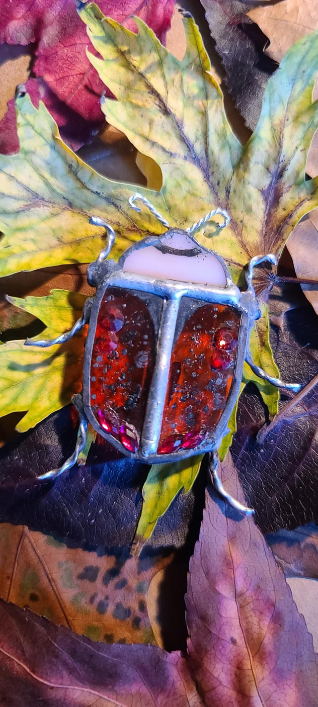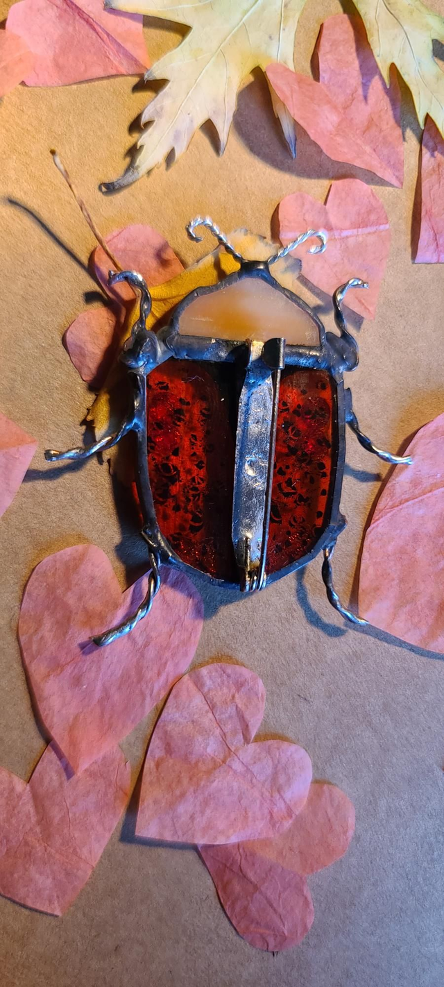 Scarabée en verre, au corps rouge transparent et à la tête rosée, en Tiffany et monté en broche