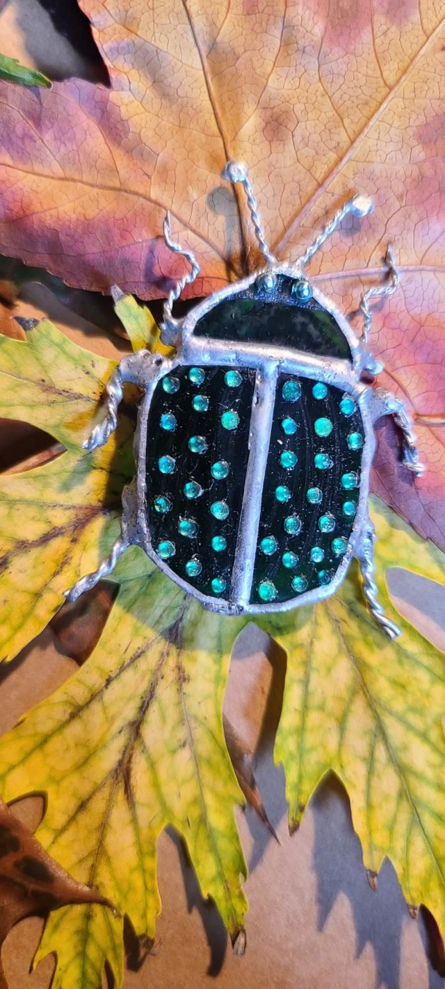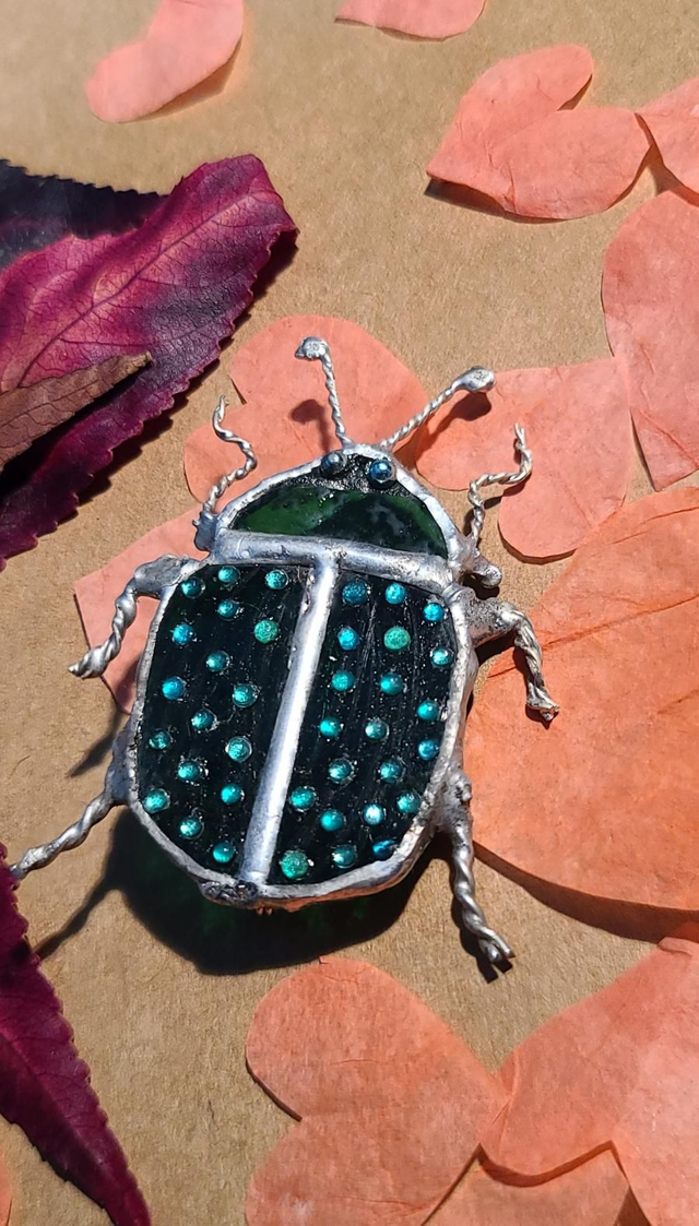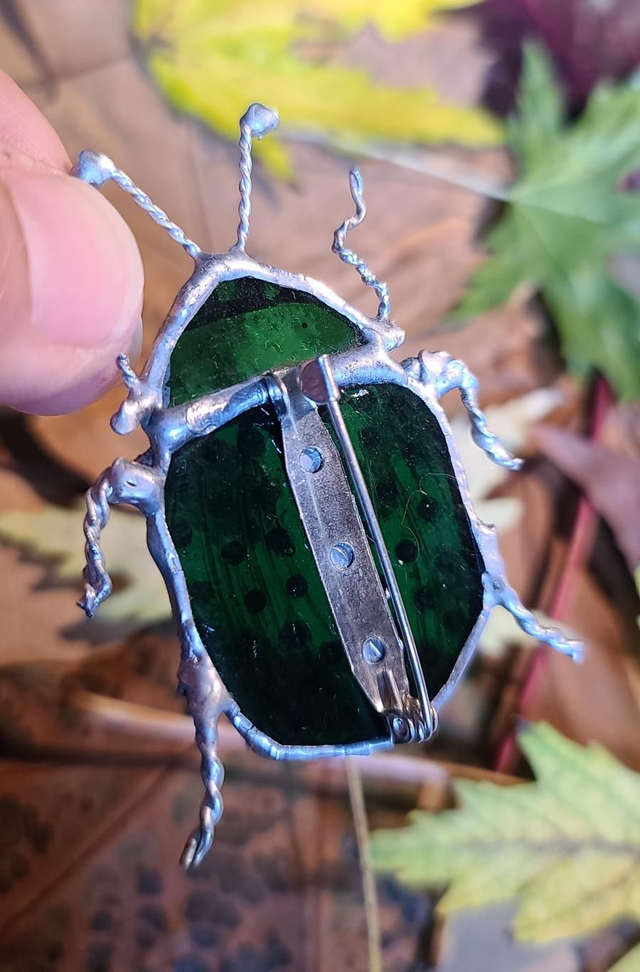 Scarabée vert en Tiffany monté en broche.